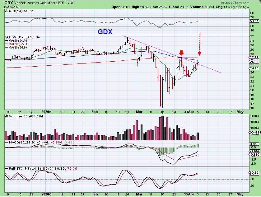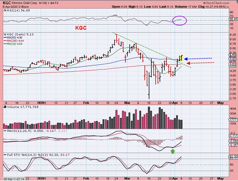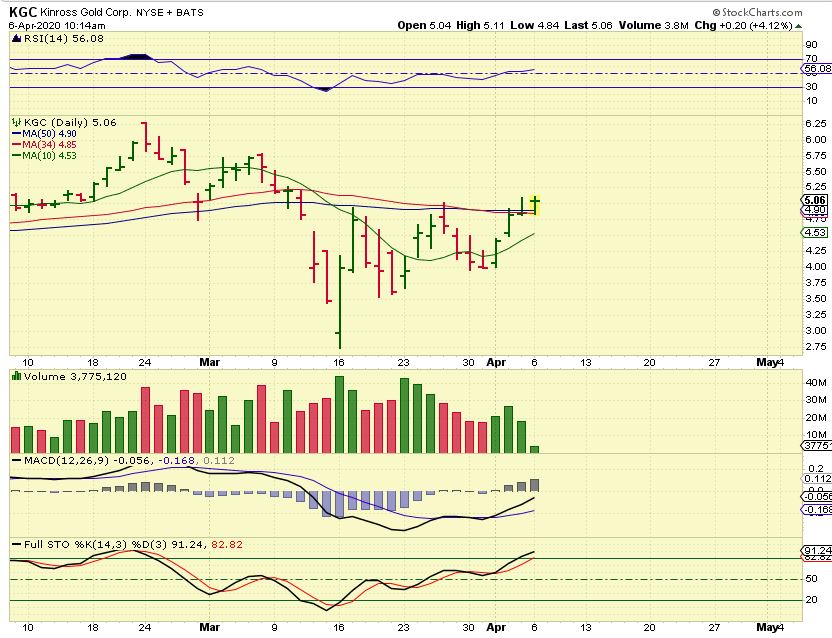 KGC–  Last week I said that I bought KGC near $4 and it is now $5. It moved above the 10, 20, 34, 50 & 200sma ( Giving us hope that GDX will do this too). This was Monday morning, did it close above the moving averages?
