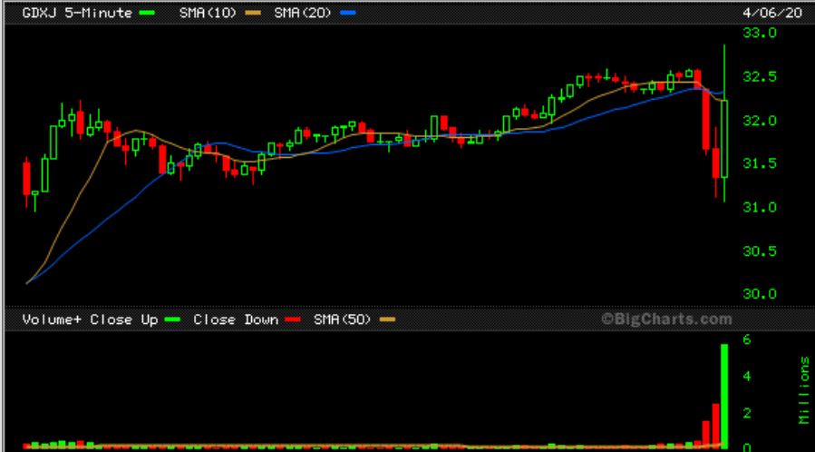 GDXJ 5 MINUTE – If you were in front of the screen, you saw Miners quickly sell off right before the close yesterday, and  then they reversed higher again. I was hoping that this would sling shot GDX through that 50sma before the close , but it didn’t. This action was just a shake out so far.