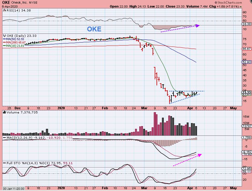 OKE – I really like this set up, do you see the potential? It already moved from $15 to $25 and pulled back to $20, but it hardly looks like that on this chart-  THAT is what I mean by these move big. $25 to $20 in 1 day? That said, it also may run to the 50sma at $55.  🙂