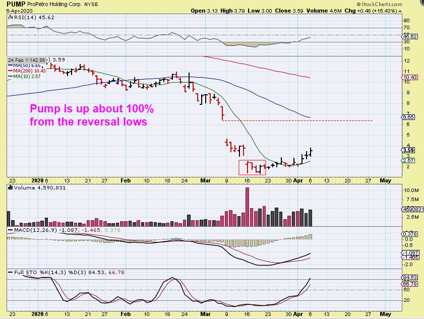 PUMP – I have already made great gains on PUMP, actually riding it twice out of these lows. My position was a small starter, but it taught me what to expect when it bounced from $2 to $3 to $2 to $3 in that base action. It looks so easy on the chart,  but when your account has a few thousand shares and you gain and lose a few thousand day after day, it is a whole different feel to it. Now PUMP looks to be moving higher out of the base. I’d like to see the others follow.