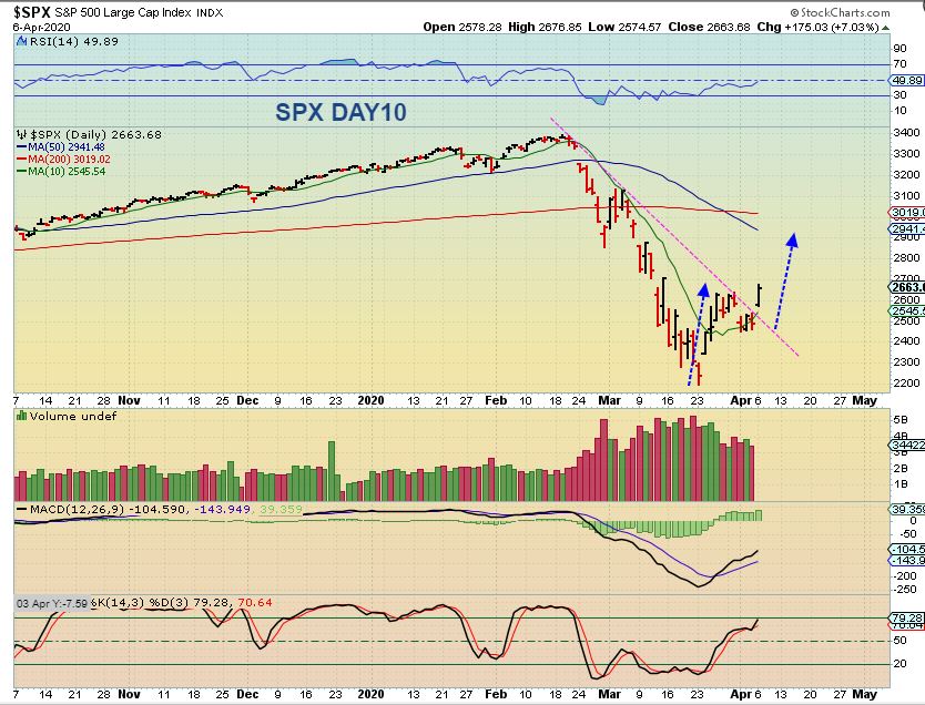 SPX – We actually bought the reversal candle ( I mentioned that I bought SOXL, since it bottomed first) and we had our pullbac to the 10sma  (normal) and now we have follow though higher. You could have added at the 10sma, or even started a small position yesterday.  If the SPX moved up 7%…