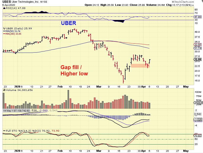 UBER  filled a gap and reversed. Uber really got crushed , dropping from $42ish to below $15, but then bounced to almost $30  ( 100%).  after a dip to $22, it may run to the 50sma at $32ish ( or more).  AGAIN, THESE SWINGS ARE BIG, so the ride can be tough if your positions are too big.