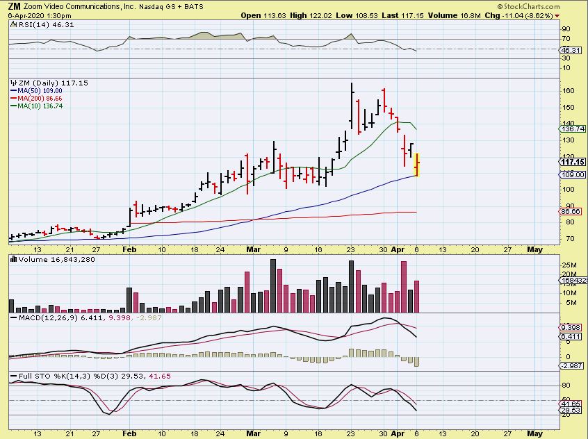 ZOOM VIDEO (ZM) reversed yesterday at the 50sma. This can be bought with a stop. A run back to the highs would be $110 to $160+.  It may or may not continue to be choppy for a bit, since the stochastics is not oversold.