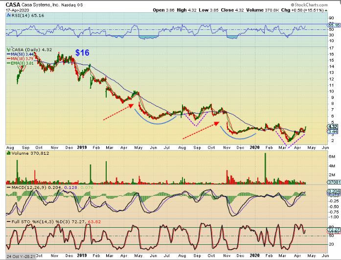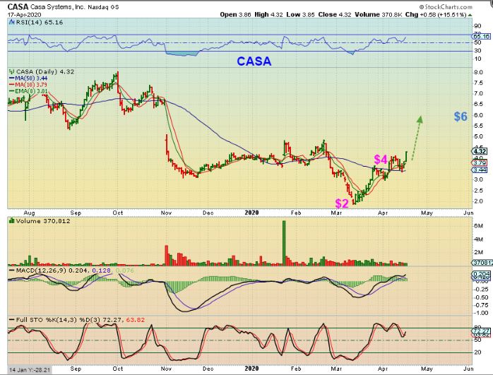 CASA – You can see that CASA has had a strong bounce from $2 and has set up bullishly above the 50sma at $4.  It dropped to $2 and bounced to $4, and it looks like it wants to head to $6, but does that mean that all is Good now going forward, even if it runs to $6?  Well…