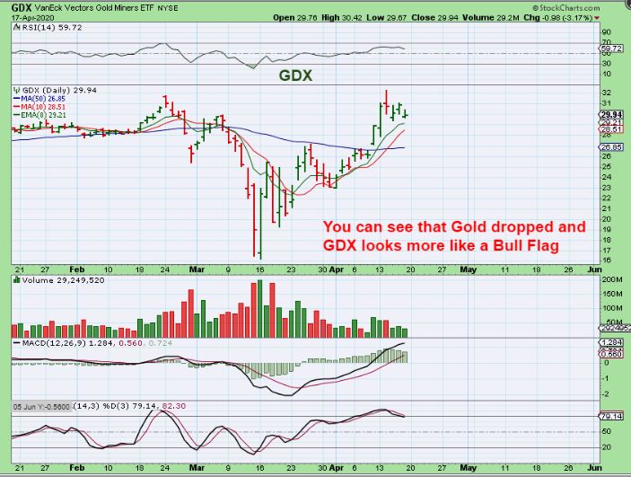 GDX DAILY #1– Gold broke down Friday as seen in its daily chart, but Miners didn’t follow. This does look a bit more like a bull flag, and next week will answer all the questions that the next 3 charts bring up 🙂 – Like “Is this a bull Flag?” and will Miners continue to resist Golds dip? If so …