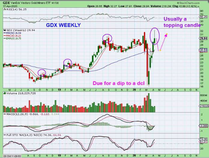 GDX WEEKLY #1– GDX also put in a weekly topping candle, so a dip to the dcl is expected one way or another.  $26.50 is the weekly 50 ma.
