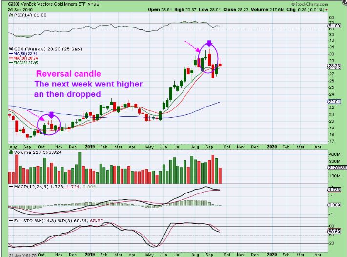 GDX WEEKLY #2– On this chart I am pointing out PAST Weekly Reversal candles. Why? Just to show that during the week following those reversal candles, price actually hit new highs again before dropping. THAT could explain a POP & DROP from a Bull Flag as shown in the daily charts above.