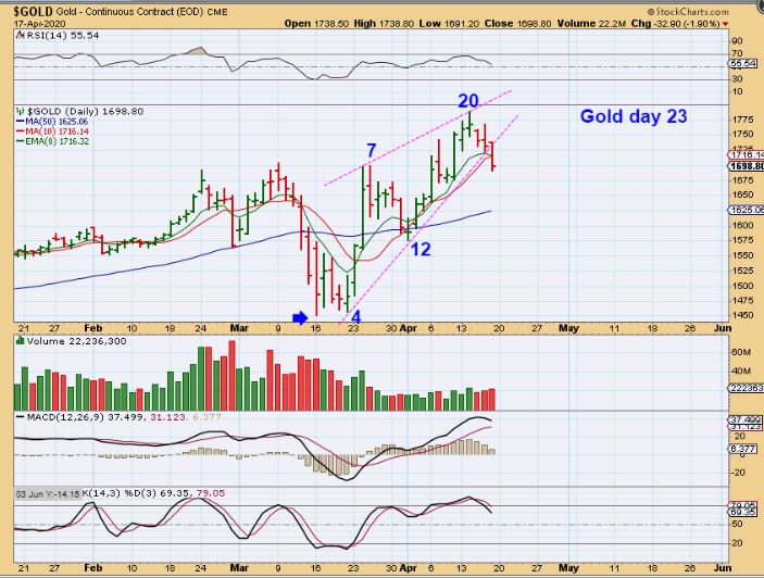 Please take another look at the Theme Picture that I chose for this report. That is considered a bullish set up, but is it climbing straight up? No. We see consolidation, choppiness, and pull backs along the way, yet it still climbs higher under bullish conditions.   We have that now in most sectors of the Markets.  We are trading moves out of ICL’s, and the run higher has been pretty steady and profitable. That said,  time has begun to run long with the Miners, and they will be coming due for a dcl.  I just want that opening theme picture to help everyone to be prepared for some possible selling, but I do expect higher prices again over time.  Why? With the first daily cycle out of the crash being as strong as it has been, we would view the next dip into a dcl as a buy opportunity if you have cash on hand. It should be a higher low, and the 2nd daily cycle should rally higher.    Individual Miners will also likely act differently, and that may affect how low the pull back becomes. Next week will give us additional insight in all of the sectors.