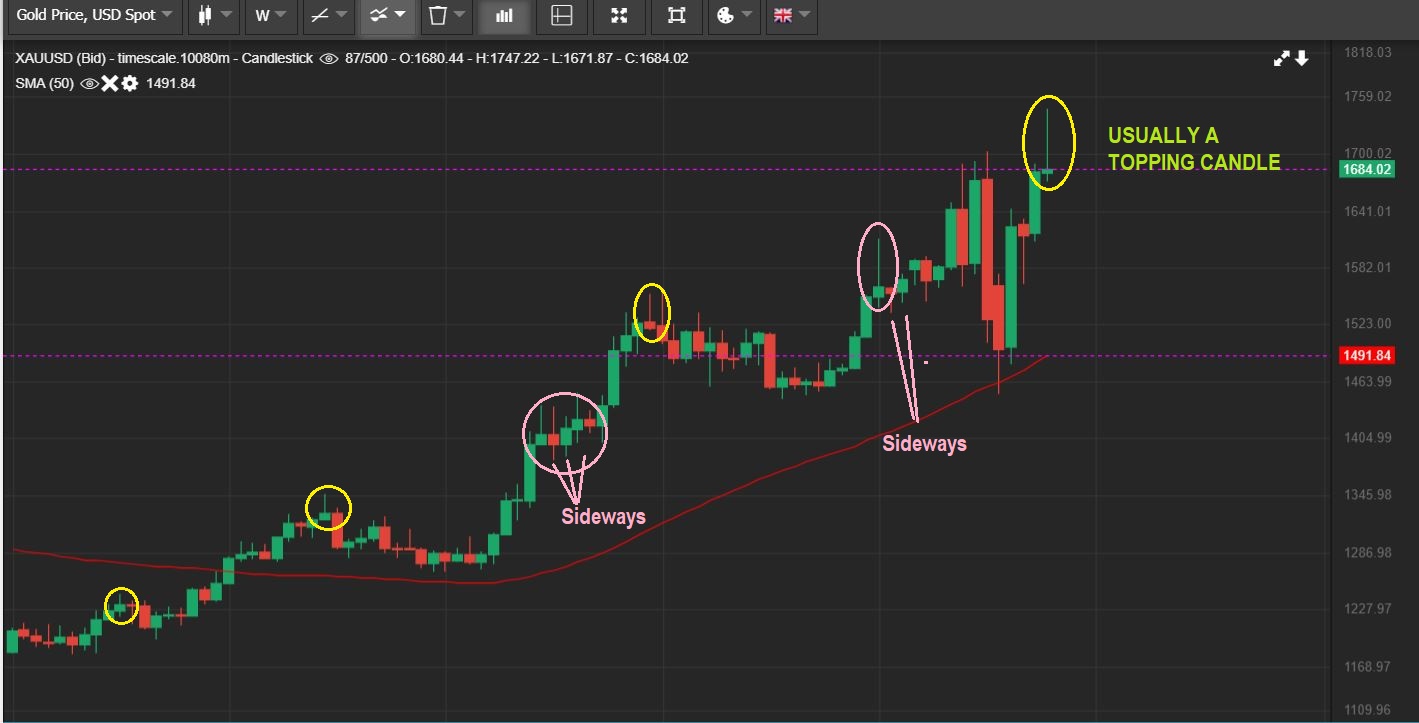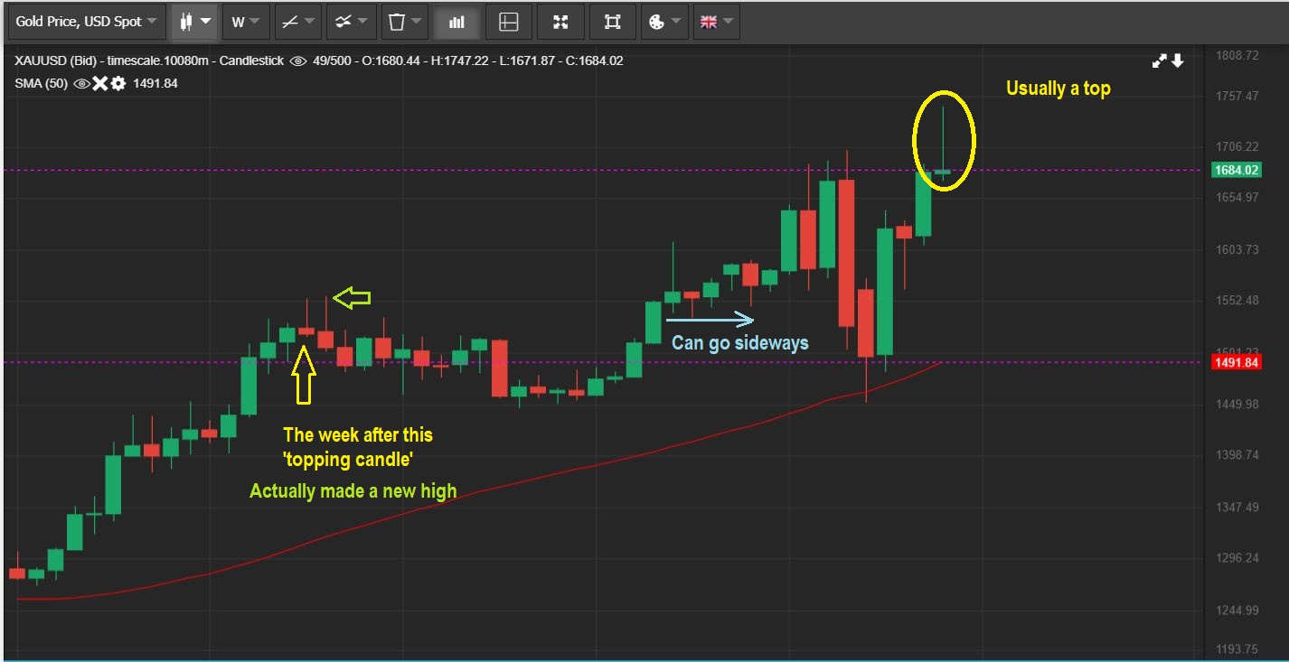 1. Gold has a topping candle, but in the past we even had one that saw the following week make new highs before dropping lower.  So Gold can move higher next week, but we are coming due for a low soon.