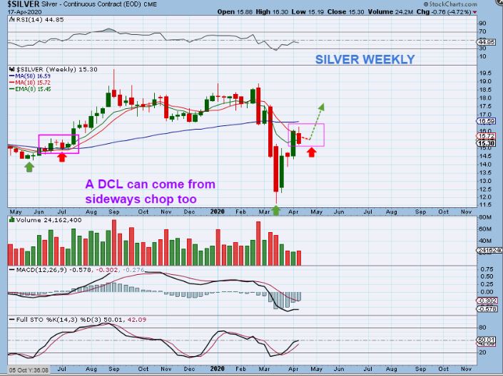 SILVER WEEKLY – Silver has not moved as Bullishly as Gold, it didn’t run back to recent highs yet, but it does look like it is forming a V-Bottom. A dip to a dcl will not hurt this set up.
