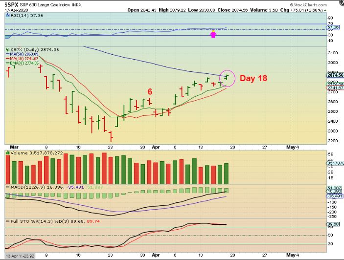 SPX DAILY – It was expected that the SPX could break above the 50 sma, because we watched the NASDAQ AND SOX do that. We are on day 18 of the first daily cycle, a daily cycle that I would expect to form as right translated, and can be 40+  days long. So…