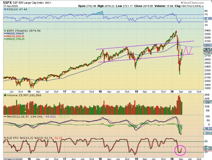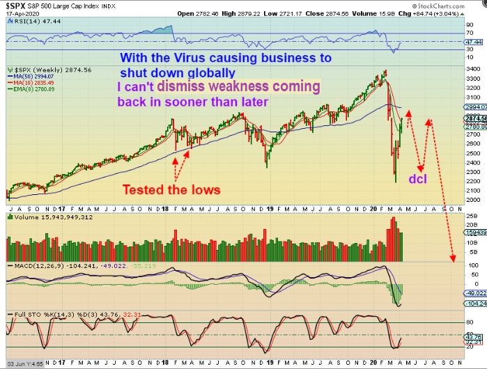 SPX WEEKLY with the Coronavirus closing down so many business, the markets are now acting like all is well, and nothing is wrong.  We could get a reality check in the markets after this daily cycle peaks too. The markets Looked VERY BULLISH  RIGHT BEFORE THE CRASH, right?  It can happen again, so we use stops and I’d even lighten up if I see tops start to develop in this sector.