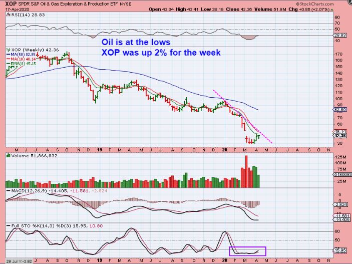 XOP WEEKLY – Step by step, we’ll see how this sector does once Oil starts moving higher too. Dec 2018 was a V-Bottom and then sideways. If this starts trading sideways like it did then, I may stop trading this sector, but for now I have been looking for higher price. The trades in this sector have been good  ( MRO, APA, BE, PUMP, PVAC, OKE, VLO, etc. )