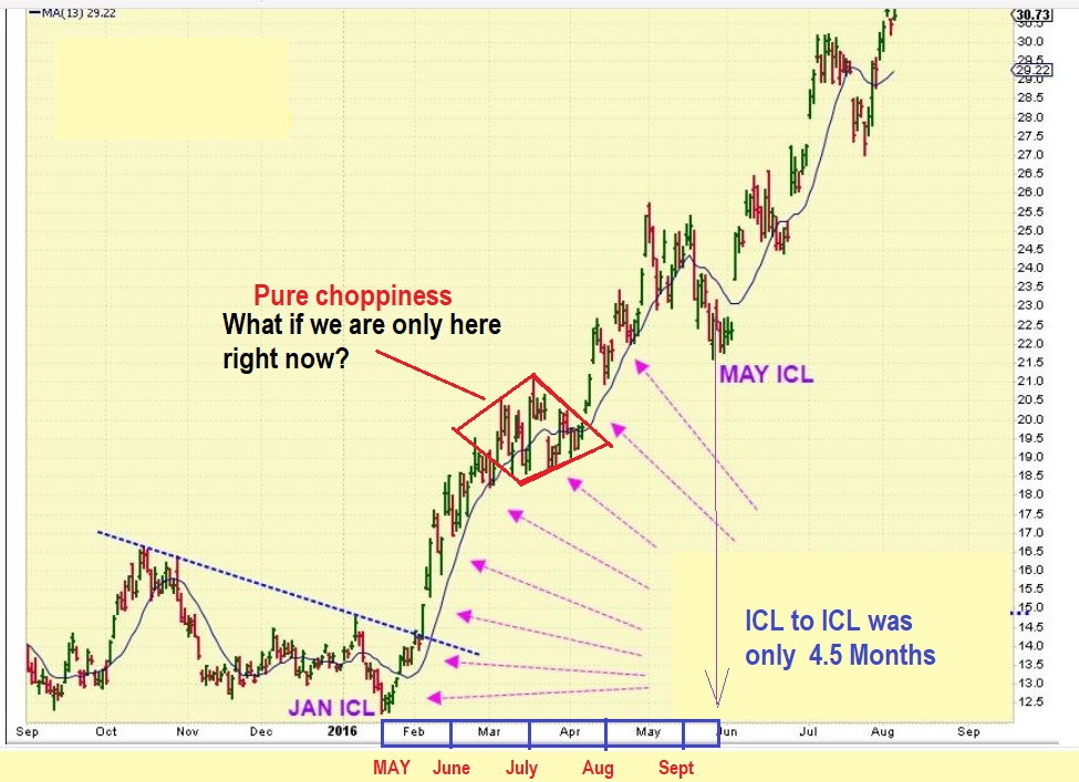 2016 had a V-Bottom sell off too, and then that ramp – up – run out of those lows was ‘relentless’. Pull backs only lasted a couple of days. Try Finding an obvious DCL every month or so, and it is impossible, right? Selling to get back in lower did not work then. GDX ran from $12 to $31 on this chart and ‘deep’ dips were rare, with the exception of that MAY drop, which was an ICL.