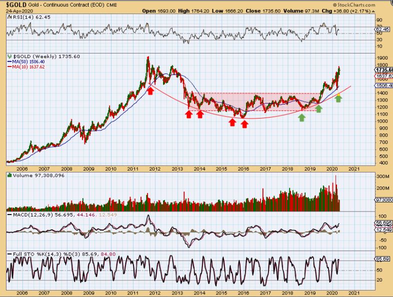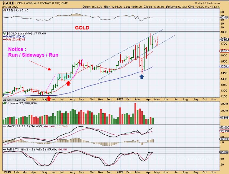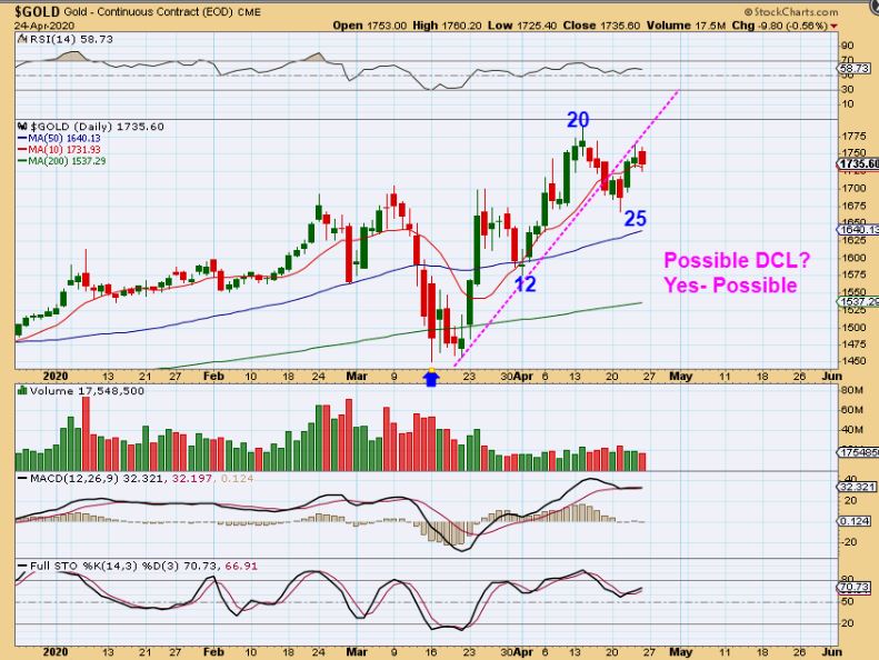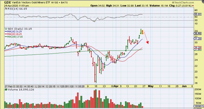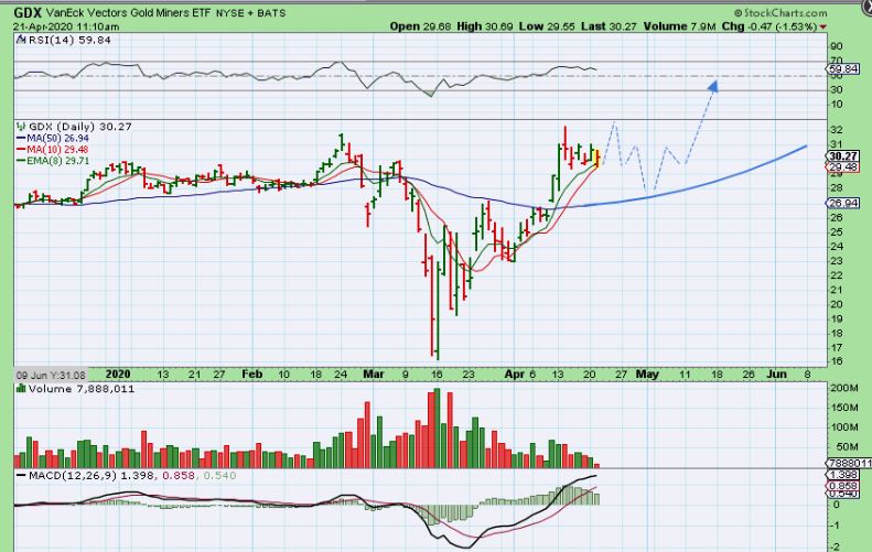 The Precious Metal Bulls are running and even if Miners pause here, it should just be a brief one before the run continues higher. THAT means that we will be making money in the Month of May too! That means that this weekend we can just put the markets aside mentally, all looks good! With that thought, rest up and if possible we can use our energy helping family and friends to cope with this current global situation. My wife and I love to offer to do some grocery shopping for an elderly couple that live on our street. They are very concerned about going out, touching shopping carts, breathing the air in a confined spaces, etc.