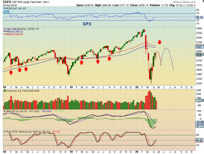 SPX MARCH 27th – Over a month ago I went long at the lows and drew this chart. I mentioned that I’d expect 2 daily cycles higher in the bounce and then this might roll over again into a bear market. I drew it to look ‘roughly’ like this…