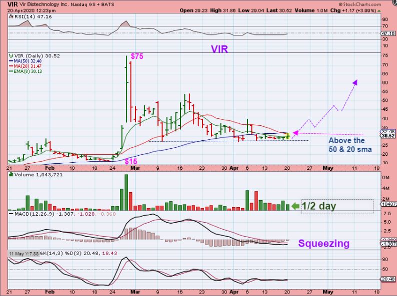 VIR was mentioned on April 20 also, but it needed to get above the 20 & 50 sma to really trigger the buy. It could be bought here at $30 or wait….