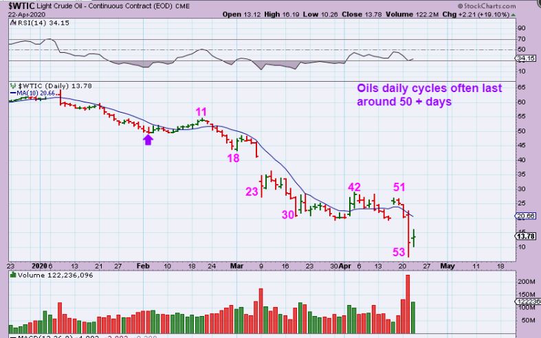 FROM WEDNESDAY : WTIC – I have pointed out that Oils cycles normally can last around 50 days normally. We are now ( after a massive collapse) At day 53. So now Oil could bounce, but as has been pointed out in the recent reports, OIL STOCKS have actually been very bullish for weeks…