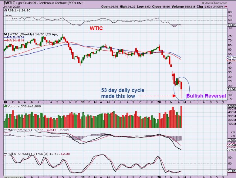 WTIC WEEKLY – Now at the end of the week we have a reversal candle, because Oil moved off of the lows on Wed, Thurs, and Friday. Oil stocks are bouncing back making BIG gains- I have covered that in daily reports.