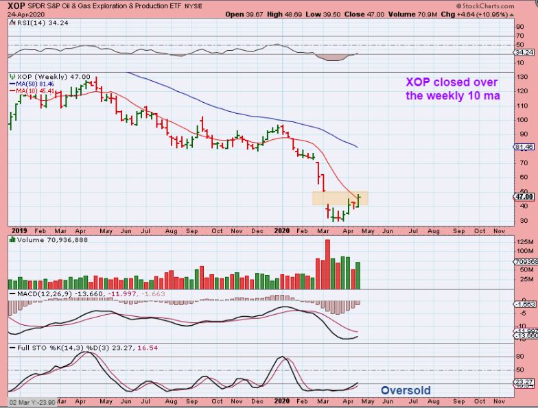 The XOP Weekly shows that Oil stocks bottomed well before Oil did, and I saw signs that they were bottoming in the charts. That is why I traded them despite the fact that Oil was still crashing down. Now we have closed above the 10 weekly MA. With what should be an ICL in Oil- These Oil Stocks are now less risky. We discussed my list and traded some on that list, which includes APA, OKE, MRO, XOM, BE, TUSK, VLO, WTI, OAS, PVAC, CVI, AROC, CLB, BTE, ERF, WLL, COP, LPI, DNR, and many more. Some have already doubled off of the bottom. Notice that XOP remains very oversold. 🙂
