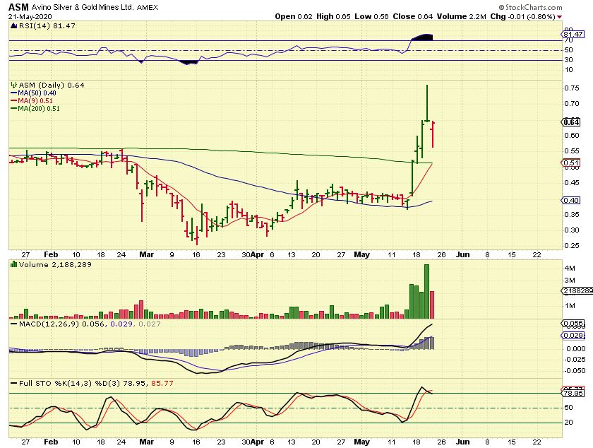ASM dropped A LOT, actually from $0.75 highs to $0.56 lows in 2 days, but it started to recover into the close. That seems to indicate that buyers were there stepping in. Does that mean that the sell off is over? Not really, but it shows ‘buy the dip’ mentality may support price a little during times of selling.