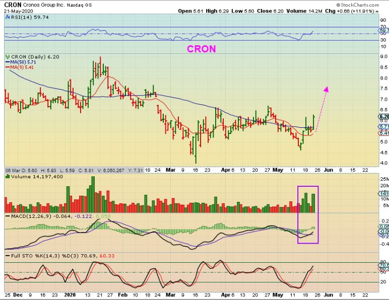 CRON is not a ‘lagger’, but it isn’t overly extended. It has nice volume and moved from roughly $4.50 to $6.20. Big move and probably just starting.