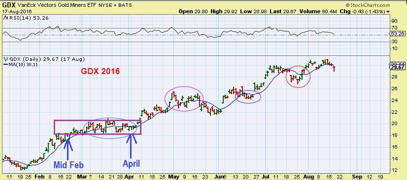 Just by looking at the 2016 GDX run that I posted in the Wednesday report, you could have double checked that detail. Looking at that 2016 run, we see that the 10sma was violated repeatedly during those choppy times, but it remained a Bull. I am going to point something else out that some will hate…