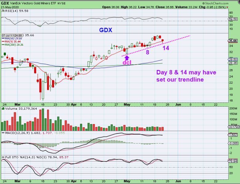 Some were concerned about GDX dipping below the 10sma. One reader emailed that he thought that was a violation of cycle rules. It is not. You can see that day 8 broke the 10sma in this run too. In the first daily cycle GDX broke the 10sma too. That does NOT violate anything, there is no rule there. In fact…