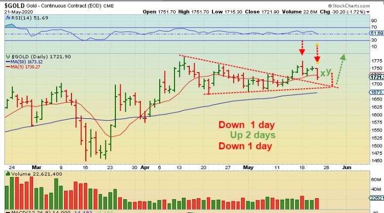 GOLD dropped yesterday and looks to be trying to back test a recent break out. This may be all we get for a dip, or it MIGHT even drop further, since we don’t have a clear back test touch. Did you notice the 1 down red day, 2 up green. One down red day? Well…