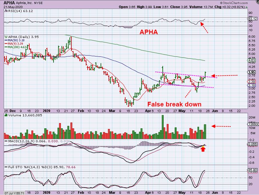 APHA -After putting in the lows at the General Market dcl, Apha climbed, stalled and Popped yesterday. This is already $2.75 to $4 already. It should at least run to the 200sma ( or more).