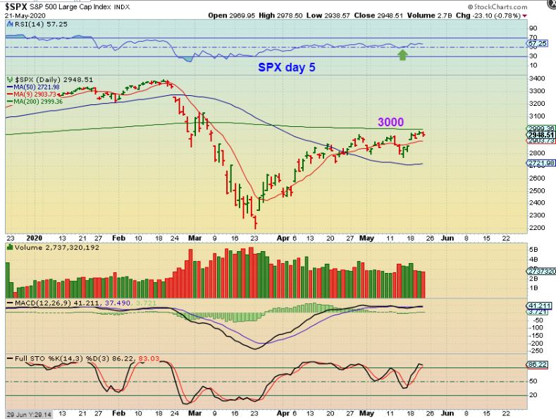 SPX – The S&P is trying to break above that nice round number 3000 ( also the 200 sma) . It is only day 5 of the 2nd daily cycle, so it should have plenty of chances to do that.