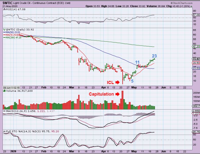 WTIC – Oil has continued higher as expected after putting in that absolute panic crash low. It has been green for 7 straight days ( 2 weeks of trading), so it is due for a pull back at any time. Watch the 10sma. I Noticed that many Oil Stocks had bottomed weeks before Oil, so we were already trading this sector in March, and…