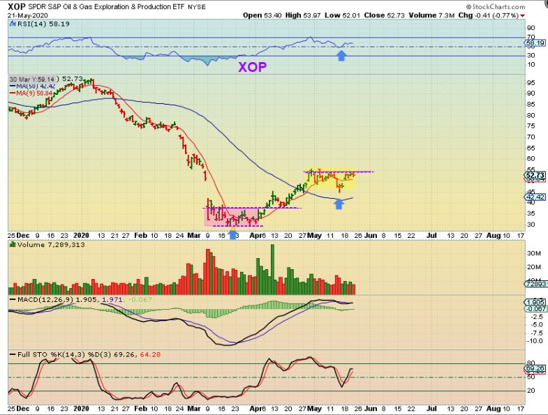 XOP – Oil stocks bottomed in March and are consolidating now, as Oil continued to climb. I would say that the XOP, XLE, and OIH put in a dcl last week. This needs to break higher or chop continues for now.