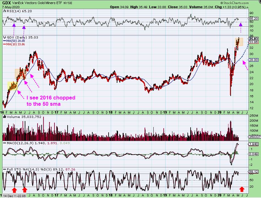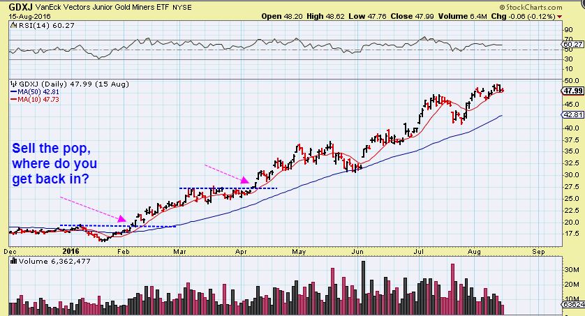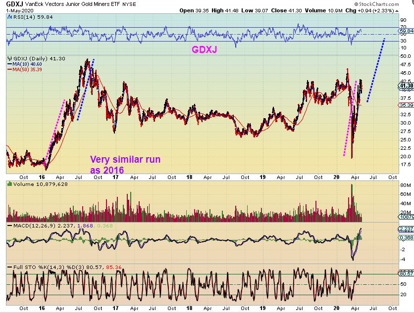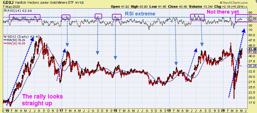 So above I have tried to show you several bullish scenarios that played out differently. In 2016, everyone seems to think that it was just a straight up rally, and it was in this GDXJ Big Picture Chart, and it ran to extremes as seen in the RSI. Most tops reach that 70+ level, but we aren’t there yet. Now as you look at this straight up rally in 2016, and compare it to now, let me zoom in on GDXJ too…