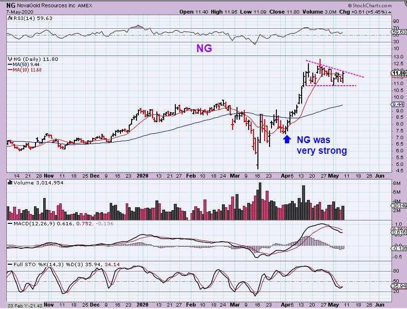 BARRICK GOLD – They can break out and back test to straighten that out, or just remain a bit choppy until it resolves. Barrick had a solid run, so a short rest here is still viewed as bullish. in fact, Barrick may be doing what Nova Gold just did…