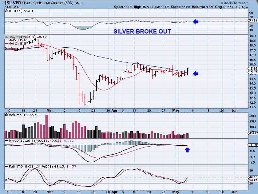 So obviously SILVER did break out. It closed above the 50 sma and that is what I said I was looking for. The price target from here is near $20, and this little move caused USLV to move up 11% . I mentioned in our live area that I sold some energy stocks and HL in the A.M. and added to USLV and JNUG. NOW WE JUST NEED SOME FOLLOW THROUGH.