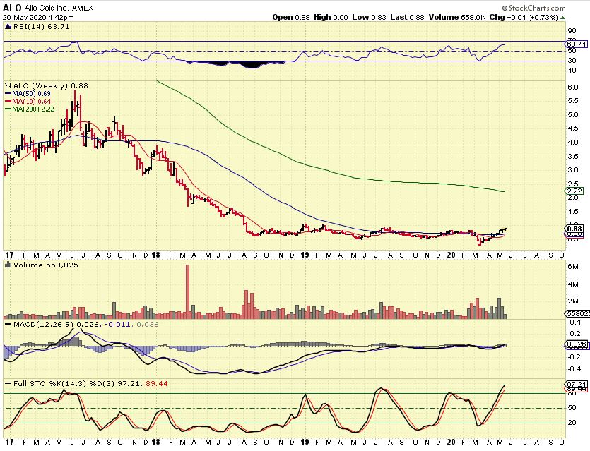 ALO WEEKLY – ALO has formed a long flat base over time and looks to be breaking from that base with the current move. If we are entering a bull market for a prolonged period of time ( And I think we are), this could make some great gains as it tries to get back up to former highs. Buy a dip.