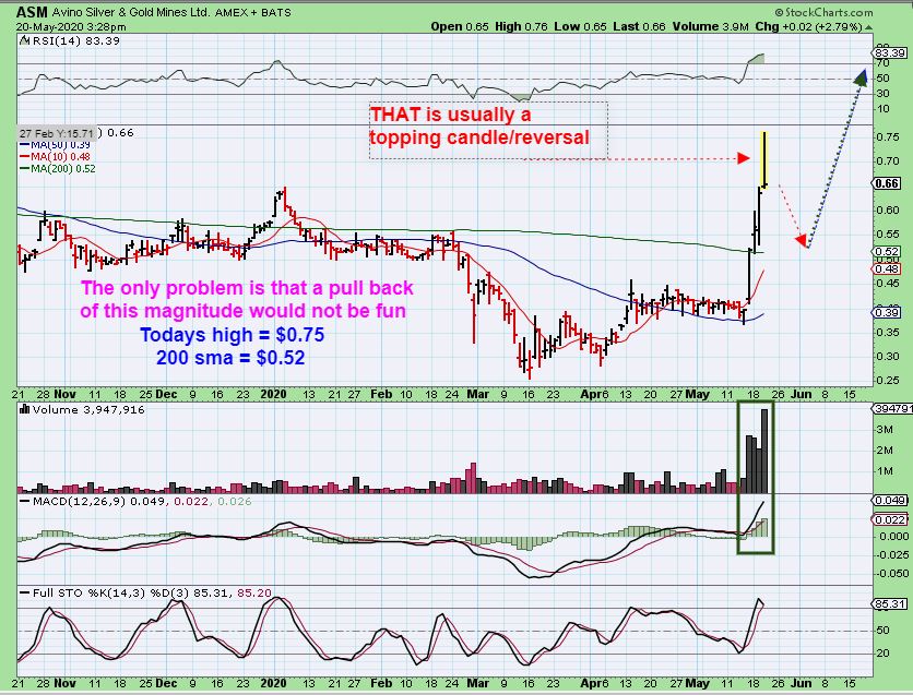 ASM – Yesterday my little rocket ship Popped another 12% or so, and then gave it up. This is USUALLY a topping candle short term. Read the chart. It could drop to the 200sma, giving up big gains, but I didn’t sell my whole position because…