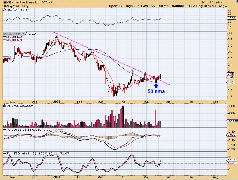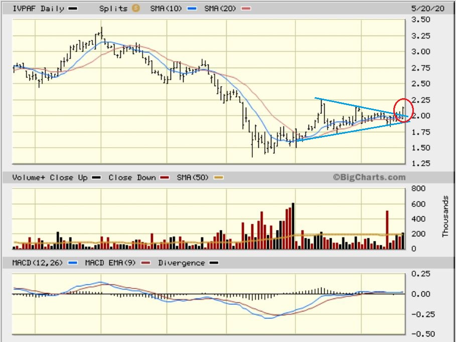 IVPAF is in a sideways consolidation and looks ready to play catch up soon. It bounced right off of the 50 sma and broke the down trend line. That is a buy as a laggard that could play catch up now.