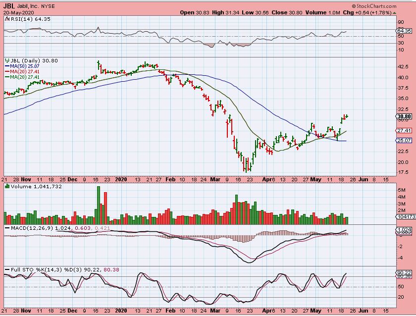 JBL popped recently too. This one I would buy if it dropped to fill the gap near that 20sma. A bad jobs report MIGHT cause that dip.