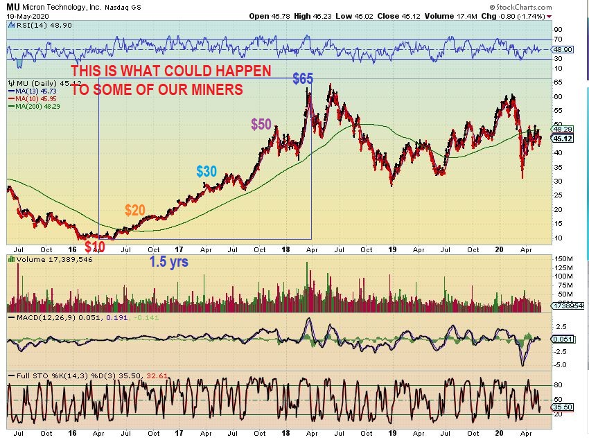 PICTURE YOUR MINERS IN A BULL RUN. THERE ARE DIPS ALONG THE WAY, BUT THE GAINS CAN BE EXCEPTIONAL. WHEN MU STARTED ITs BULL RUN IN 2016, NOTICE HOW IT WENT FROM $10 to $65. SOME MINERS CAN DO THIS TOO, WHEN BIG MONEY STARTS REGULARLY BUYING THE DIPS.
