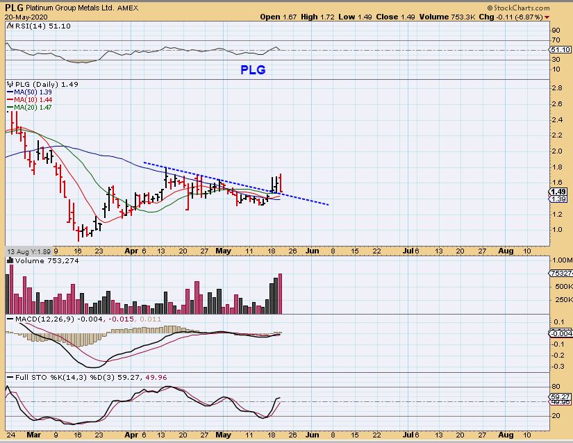 PLG – It promptly dropped to the trend line and 10 sma. It is still ok, but it lost the 200sma seen in the chart ABOVE. I am still holding it at this point, though it may drop to the 50sma 10 cents lower.