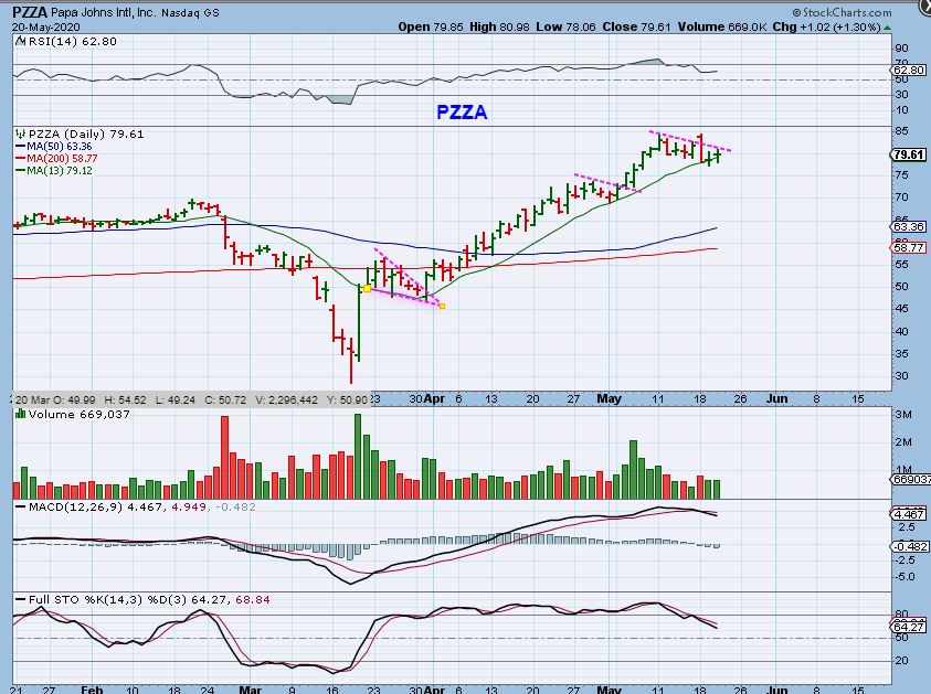 PZZA – Ordering Pizza delivery while at home has been paying off for Papa Johns. Buy the dips to the 13 sma has been working.