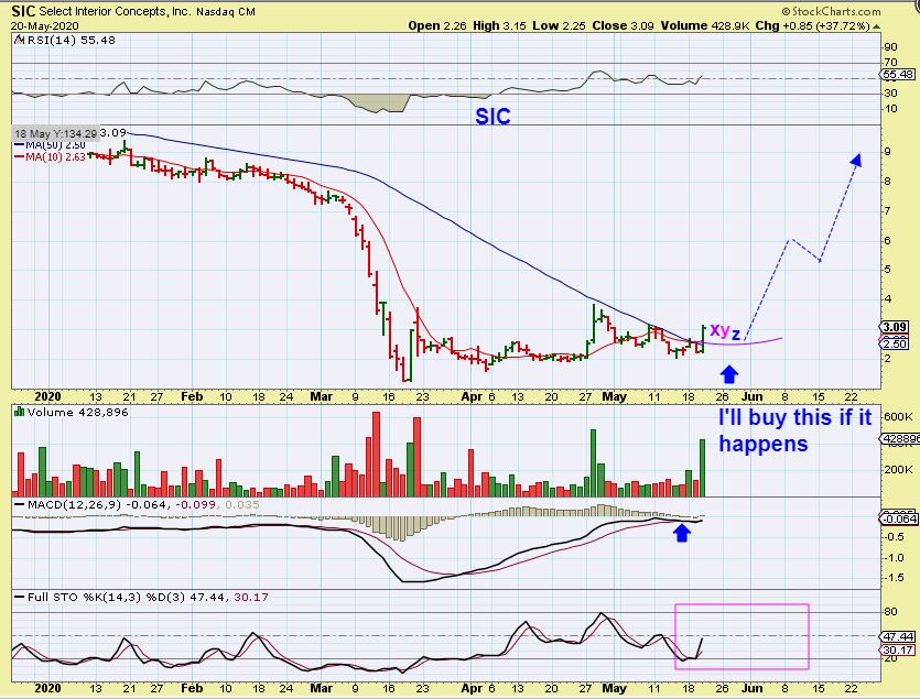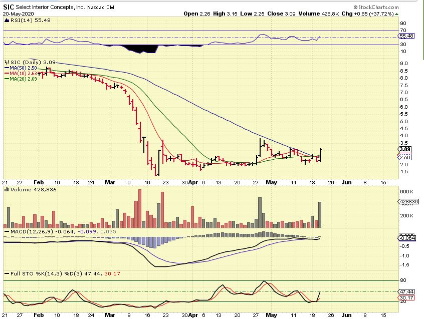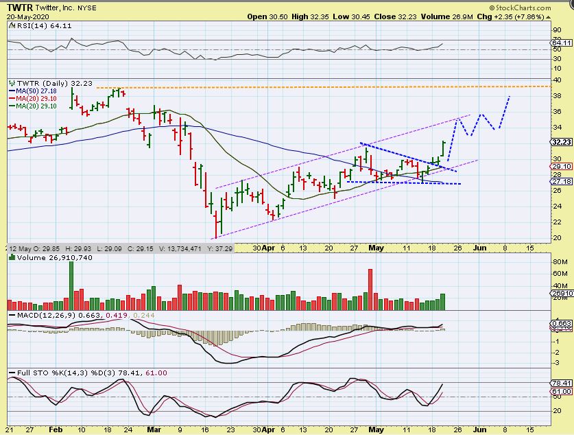 BYD – This was in yesterdays report and it pushed up another 6%. I still like it, it is a solid bullish consolidation pattern. I mentioned that staying quarantine might help a gaming stock ( Thinking that they did on-line gambling/ gaming) , but I was corrected : They do casinos. So maybe the re-opening up of Vegas slated for June 1 is perking up the stock? Regardless, the volume is coming in and price is rising as it breaks from a bullish flat top wedge.