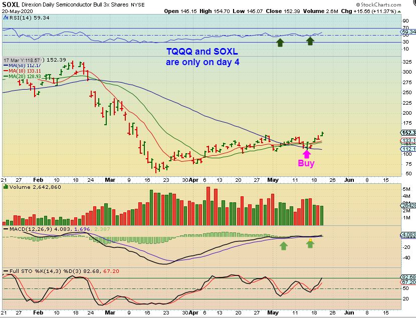 SOXL – The General Markets are early in their 2nd daily cycle ( Day 4) , so even if a negative Jobs Report dips the markets today, it may not last very long. I recommended TQQQ, SOXL, and UPRO as leveraged vehicles at the lows, so far they are doing well. The Semiconductors often lead, so I want to look at a few Semi’s & Tech stocks here.
