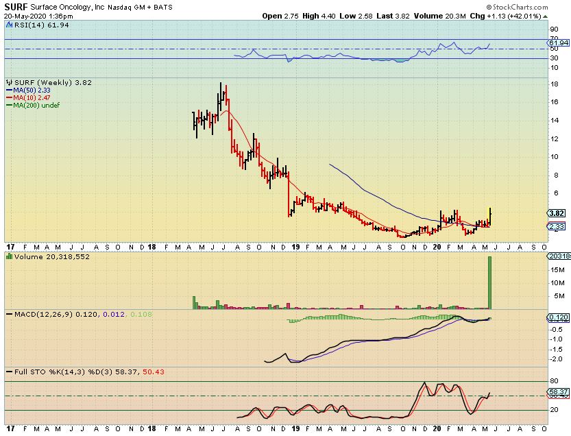 SURF WEEKLY – On My Watch list: ( This is a clinical-stage immuno-oncology company, focusing on biological pathways critical to the immunosuppressive tumor micro environment and the development of next-generation cancer therapies) . They did SOMETHING right, popping 42%. They raised nearly 30 Million Dollars in a stock sale , from what I could see when I skimmed the news. It was on my watch list when it ran from $1 to $4 in Oct-Feb. Then it dropped with the markets. It was a bit too choppy for me to add to the reports. This base may eventually lead price back to the highs when it was an IPO near $20. If it starts trending higher, it would then become a buy. It may be good for your watchlist?