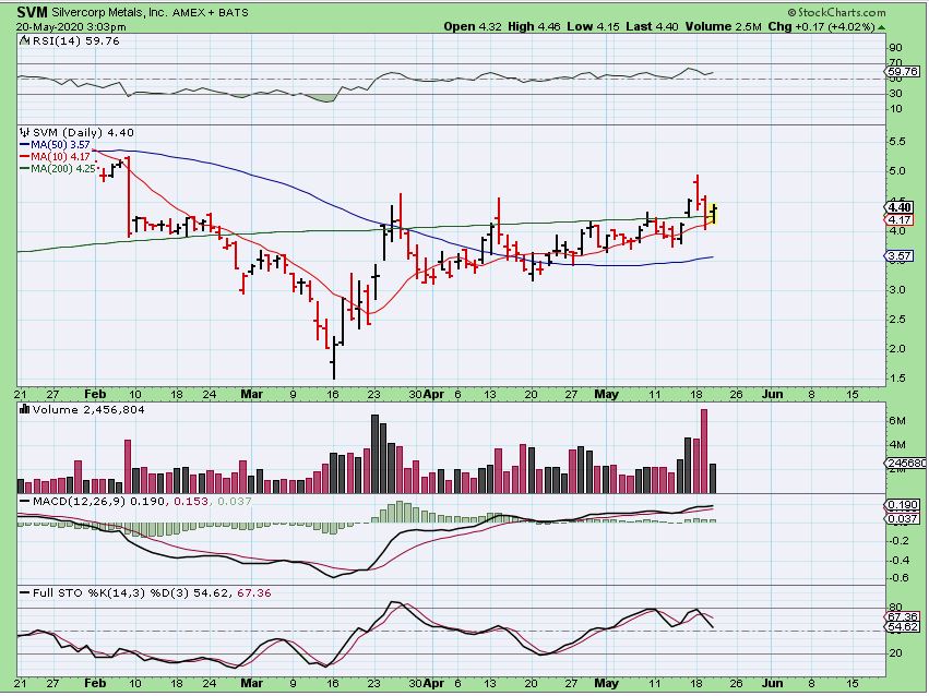 FROM YESTERDAY : CDE exploded with Silver and is still flying. It COULD be bought at this 200sma with a stop under the 200, but again, it is hard to buy a stock that is up from $4 to $6 in 3 days ( that is a 50% gain in 3 days).