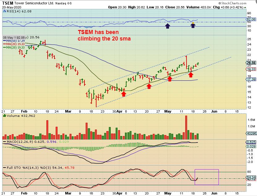 TSEM – I also like Tower Semiconductor as a buy right here, it has been steadily trending higher. IF the jobs report drops this to the lower line and 20 sma, a reversal in that area is even a better entry.