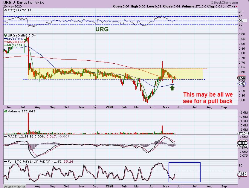 URG dropped to the 50 sma area and bounced and is pushing on the 200 sma. We could see more chop sideways or it could break out. It can be bought in this area or when it breaks out.