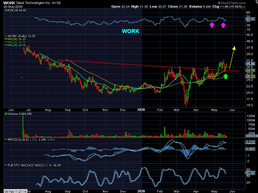 WORK – So now notice that WORK is still in the back test / buy area. It broke out, chopped sideways and is back testing now. It may be ready to head higher too.